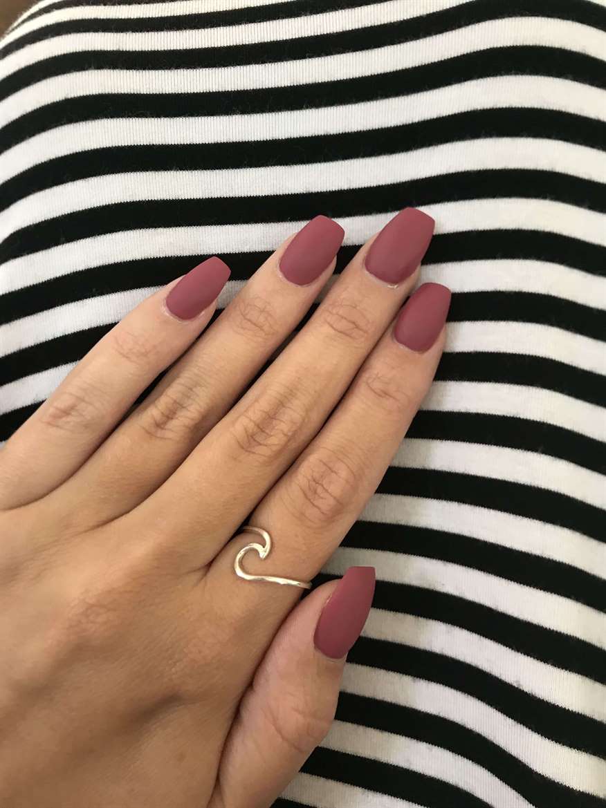 The key to finding the right shade is choosing a hue that complements your skin tone This wine nail design mimics the elegance of a glass filled with your favorite vintage Matte Coffin Wine Color Nails @kiaraskynails via Instagram